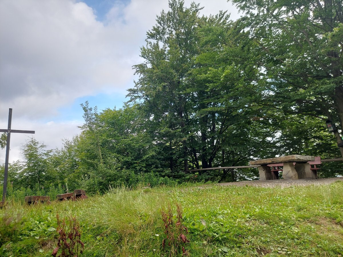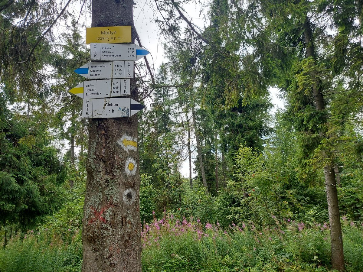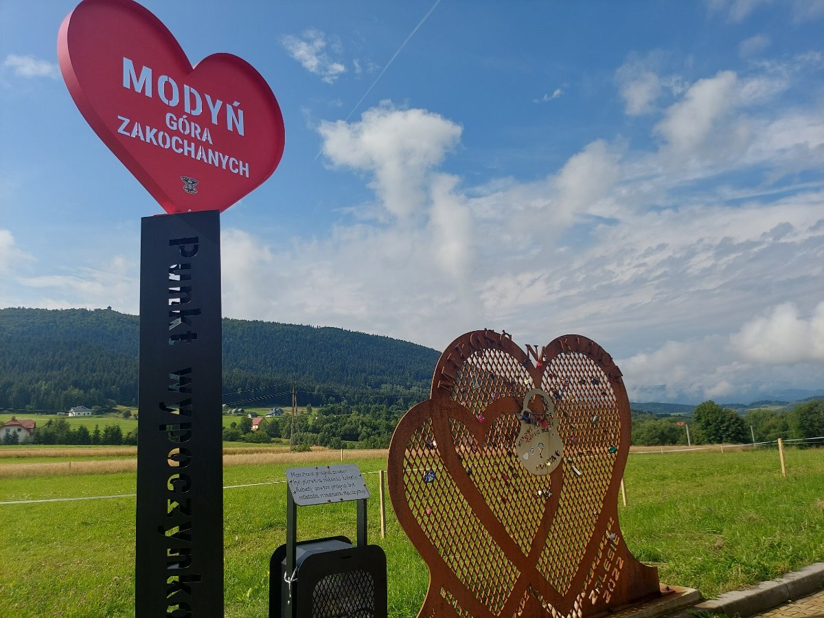 Kierując się tymi samymi powodami co @barbie609 moderidąc w Gorce, poszukalam czegos krótkiego, by zdążyć wejść i zejść między jednym deszczem a drugim. Nigdy nie byłam na Modyni zatem - czarnym szlakiem na górę zakochanych wydawalo mi się pomysłem idealnym. Trasa lekka, króciutka, taka na poobiedni spacer. Wejście na szlak zachęcające serduszkami i ławeczkami dla zakochanych -myślę że to bardzo ładny pomysł. U gory wieża widokowa, ołtarz- msza jest tu odprawiana podczas wydarzenia Odkryj Beskid Wyspowy . Są też miejsca na ogniska.