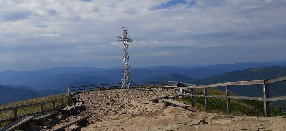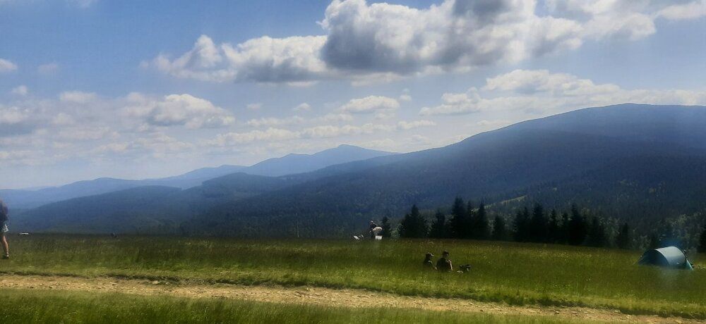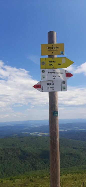 KGP skompletowana. Ostatnim szczytem była Tarnica i dzisiaj nareszcie została przez nas zdobyta. Pętelka niebieskim szlakiem z Wołosatego na Tarnicę i dalej przez Halicz i Rozsypaniec z powrotem na parking. Zajęło nam to ok. 6 godzin z przerwami na jedzenie i robienie zdjęć. Na podejściu minęliśmy 2 pary a na szczycie oprócz nas tylko jedna osoba robiła zdjęcia i zaraz uciekła. Na pozostałych szczytach po 2-3 osoby. Miła odmiana po zatłoczonych szlakach we wszystkich innych górach. Było gorąco ale tak wiało że nie odczuwało się upału i szło się całkiem przyjemnie.