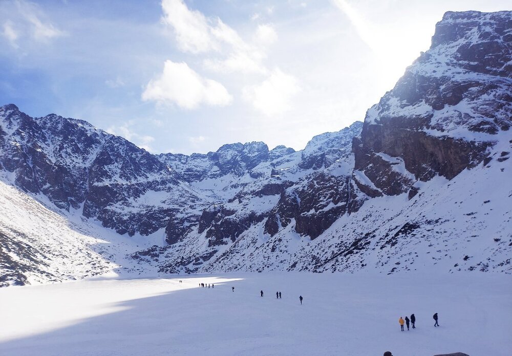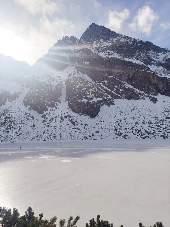 Szukając zimy powędrowałam z Brzezin do Koziej Dolinki. Widoki nie zawiodły i zima też się pokazała. Szlak z Brzezin oblodzony, od Czarnego Stawu śniegu było coraz więcej i to takiego sypkiego a Zmarzły Staw uczynił swoim zmarznięciem piękne lodowe widoki Ludzi całkiem ok. Kościelec miał branie, na Zawrat też szli. Na szlaku na Granaty kogoś było widać. Autostrada przez staw funkcjonowała bez opłat.
