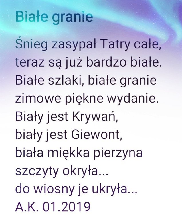 vatra Opublikowano 11 Lutego 2020 Udostępnij Opublikowano 11 Lutego 2020 2 minuty temu, Agunia napisał: Bo w Tatrach w sumie jest wszystko. "W górach jest wszystko co kocham" - ks. Tischner Tak mi się skojarzył ten cytat. Bardzo go lubię i często do niego wracam. 8 minut temu, Agunia napisał: Chciałabym mieć dom w górach. Dla mnie góry są jak dom rodzinny, do którego ciągle wracam i w którym czuję się najlepiej. 4 Cytuj Odnośnik do komentarza Udostępnij na innych stronach Więcej opcji udostępniania...